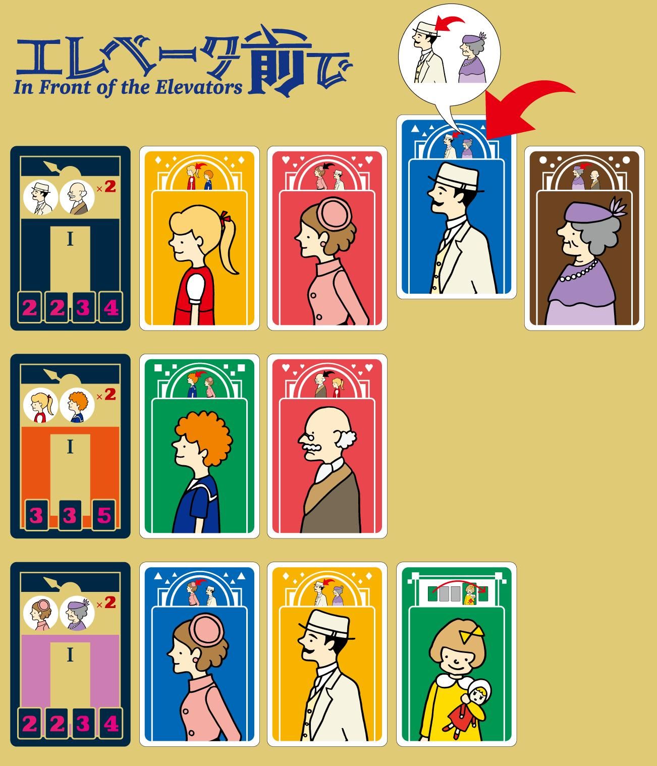 In Front of the Elevators (エレベータ前で) is een kaartspel waarin je strijdt om meer familieleden vooraan in de rij bij de lift te krijgen dan je tegenstanders.